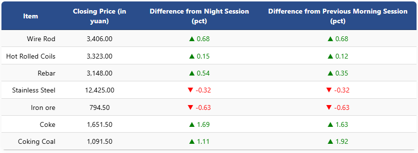 On the Shanghai Futures Exchange, rebar increased 0.54pct to 3,148 yuan (USD 445), HRC edged up 0.15pct to 3,323 yuan (USD 470), and wire rod rose 0.68pct to 3,406 yuan (USD 482). Stainless steel dipped 0.32pct to 12,425 yuan (USD 1,757) per ton.