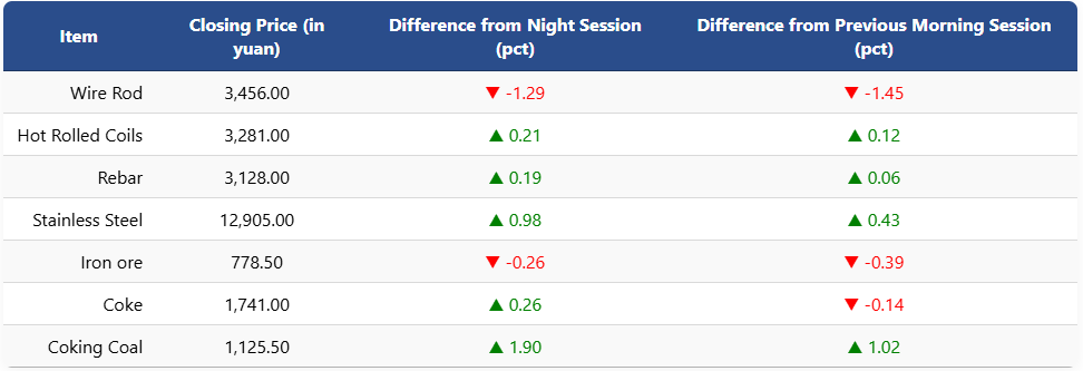 On the Shanghai Futures Exchange, rebar futures inched up to 3,128 yuan (USD 445) per ton, while HRC gained 0.21pct to 3,281 yuan (USD 467) per ton. Wire rod fell 1.29pct to 3,456 yuan (USD 492) per ton, while stainless steel futures rose nearly 1pct to 12,905 yuan (USD 1,836) per ton.