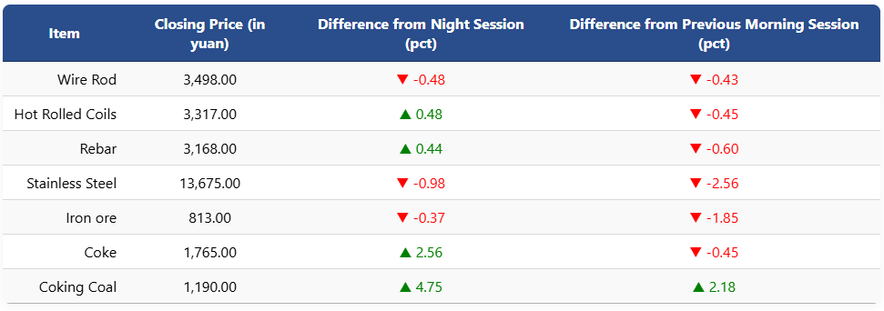 On the Shanghai Futures Exchange, rebar futures gained 0.44pct to 3,168 yuan (USD 454) per ton, while HRC futures rose 0.48pct to 3,317 yuan (USD 475) per ton. In contrast, wire rod futures edged down 0.48pct to 3,498 yuan (USD 501) per ton, and stainless steel futures fell 0.98pct to 13,675 yuan (USD 1,958) per ton.