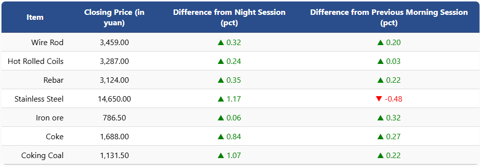 On the Shanghai Futures Exchange, rebar futures increased 0.35pct to 3,124 yuan (USD 448) per ton, while HRC edged higher to 3,287 yuan (USD 471). Wire rod rose 0.32pct to 3,459 yuan (USD 496), and stainless steel futures advanced 1.17pct to 14,650 yuan (USD 2,100) per ton.