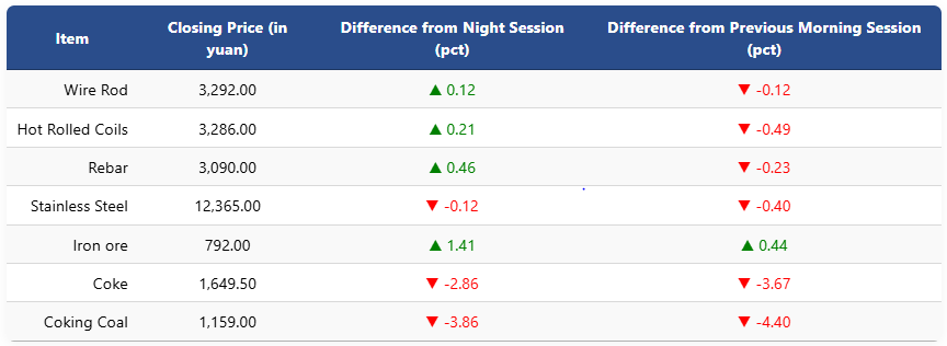 On the Shanghai Futures Exchange, rebar gained 0.46pct to 3,090 yuan (USD 435), HRC edged up 0.21pct to 3,286 yuan (USD 462), and wire rod also inched higher to 3,292 yuan (USD 463). Stainless steel slipped to 12,365 yuan (USD 1,739) per ton.