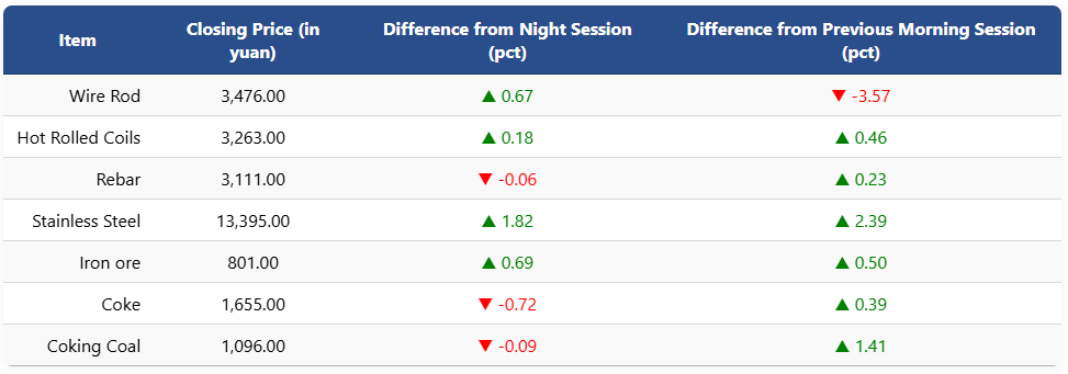 Overall, most steelmaking raw material and steel futures posted gains compared with the previous morning session, reflecting broad-based improvement in market sentiment.