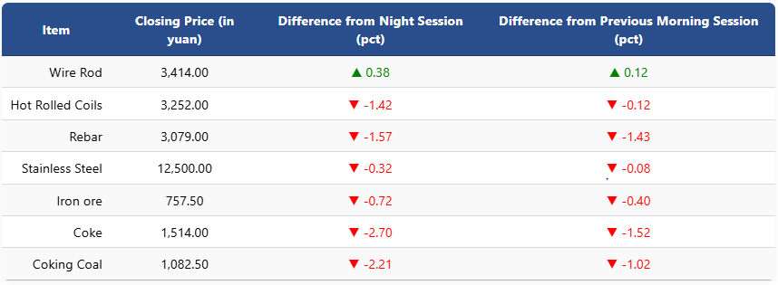 On the Shanghai Futures Exchange, rebar declined 1.57pct to 3,079 yuan (USD 436), HRC fell 1.42pct to 3,252 yuan (USD 460), wire rod edged up 0.38pct to 3,414 yuan (USD 483), and stainless steel slipped 0.32pct to 12,500 yuan (USD 1,770) per ton.