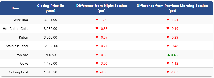 On the Shanghai Futures Exchange, rebar declined 0.87pct to 3,060 yuan (USD 434), HRC eased 0.83pct to 3,232 yuan (USD 458), wire rod fell 1.92pct to 3,321 yuan (USD 471), and stainless steel slipped 0.71pct to 12,565 yuan (USD 1,781) per ton.