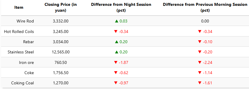 On the Shanghai Futures Exchange, rebar rose 0.26pct to 3,044 yuan (USD 428), HRC increased 0.06pct to 3,252 yuan (USD 457), wire rod slipped to 3,332 yuan (USD 468), and stainless steel climbed 0.28pct to 12,605 yuan (USD 1,770) per ton.