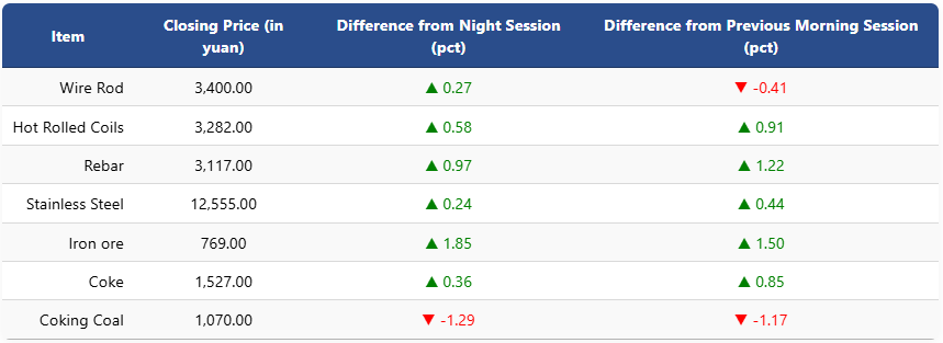 On the Shanghai Futures Exchange, rebar climbed 0.97pct to 3,117 yuan (USD 441), HRC rose 0.58pct to 3,282 yuan (USD 465), wire rod added 0.27pct to 3,400 yuan (USD 481), and stainless steel increased 0.24pct to 12,555 yuan (USD 1,778) per ton.