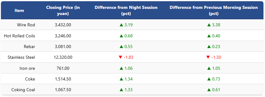 On the Shanghai Futures Exchange, rebar rose 0.55pct to 3,081 yuan (USD 478), HRC climbed 0.68pct to 3,246 yuan (USD 461), wire rod jumped 3.19pct to 3,432 yuan (USD 487), while stainless steel futures fell 1.83pct to 12,320 yuan (USD 1,749) per ton.