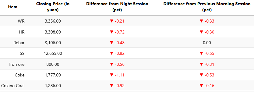 On the Shanghai Futures Exchange, rebar slipped 0.48pct to 3,106 yuan (USD 436) per ton, HRC fell 0.72pct to 3,308 yuan (USD 465), wire rod eased 0.21pct to 3,356 yuan (USD 471), and stainless steel declined 0.82pct to 12,655 yuan (USD 1,778) per ton.