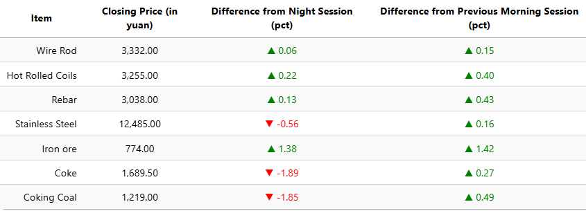 On the Shanghai Futures Exchange, rebar edged up 0.13pct to 3,038 yuan (USD 427), HRC gained 0.22pct to 3,255 yuan (USD 457), and wire rod inched higher to 3,332 yuan (USD 468). Stainless steel futures slipped 0.56pct to 12,485 yuan (USD 1,754) per ton.