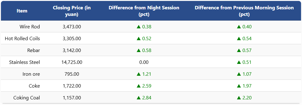 Coking coal and coke futures also posted gains, rising 2.89pct and 2.59pct to 1,157 yuan (USD 166) and 1,722 yuan (USD 247) per ton, respectively.
