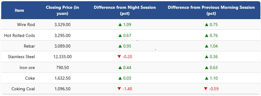 On the Shanghai Futures Exchange, rebar gained 0.95pct to 3,089 yuan (USD 435), HRC increased 0.67pct to 3,295 yuan (USD 464), and wire rod rose 1.09pct to 3,329 yuan (USD 469). Stainless steel slipped 0.2pct to 12,335 yuan (USD 1,737) per ton.