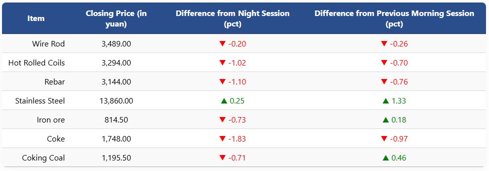 On the Shanghai Futures Exchange, rebar futures declined 1.1pct to 3,144 yuan (USD 450) per ton, while HRC futures dropped 1.02pct to 3,294 yuan (USD 472) per ton. Wire rod edged down 0.2pct to 3,489 yuan (USD 500) per ton, while stainless steel futures inched up 0.25pct to 13,860 yuan (USD 1,985) per ton.