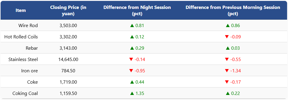 On the Shanghai Futures Exchange, rebar futures rose 0.29pct to 3,143 yuan (USD 452) per ton, HRC edged up 0.12pct to 3,302 yuan (USD 475), and wire rod climbed 0.81pct to 3,503 yuan (USD 504). Stainless steel futures slipped slightly to 14,645 yuan (USD 2,106) per ton.