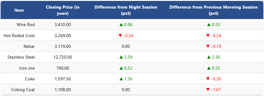 On the Shanghai Futures Exchange, rebar futures were unchanged at 3,119 yuan per ton, HRC edged down 0.24pct to 3,269 yuan per ton, wire rod rose 0.86pct to 3,410 yuan per ton, and stainless steel futures jumped 2.58pct to 12,720 yuan per ton.