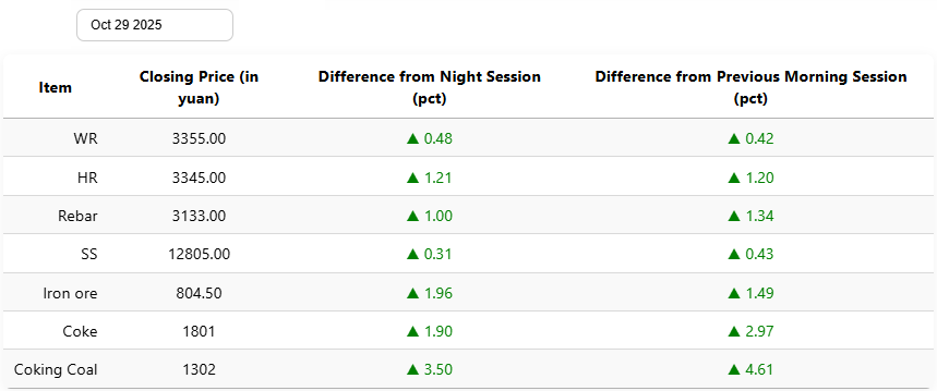 On the Shanghai Futures Exchange, rebar rose 1pct to 3,133 yuan (USD 441) per ton, HRC advanced 1.21pct to 3,345 yuan (USD 471), wire rod edged up 0.48pct to 3,355 yuan (USD 473), and stainless steel increased 0.31pct to 12,805 yuan (USD 1,804) per ton.
