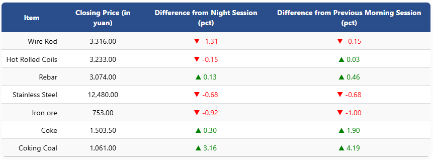 On the Shanghai Futures Exchange, rebar futures edged up to 3,074 yuan (USD 436), HRC slipped 0.15pct to 3,233 yuan (USD 459), wire rod fell 1.31pct to 3,316 yuan (USD 471), and stainless steel futures declined 0.68pct to 12,480 yuan (USD 1,771) per ton.